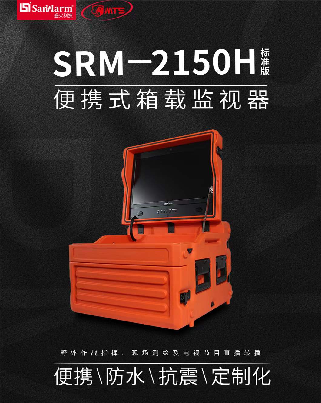 功能概述: SRM-2150是一款21.5寸英寸便携式箱载高清监视器,设计用于野外作战指挥、野外测绘及电视节目现场转播导播等。该监视器采用一体化上开屏幕结构设计,预留标准4U航空箱机架高度,兼顾防水抗震功能,广视角以及优异的亮度和对比度,为使用带来全新体验。