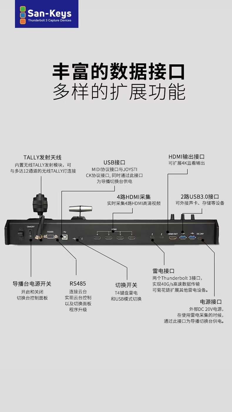 功能概述: T4是一款基于带雷电接口的直播采集切换系统,它借助雷电接口特性,实现电脑主机的PCIE、USB3.0、HDMI等数据通讯接口外延,将视频采集板卡、视频输出接口和导播切换台等融为一体,并通过一条雷电接口实现和电脑主机连接,实现采集和导播切换
